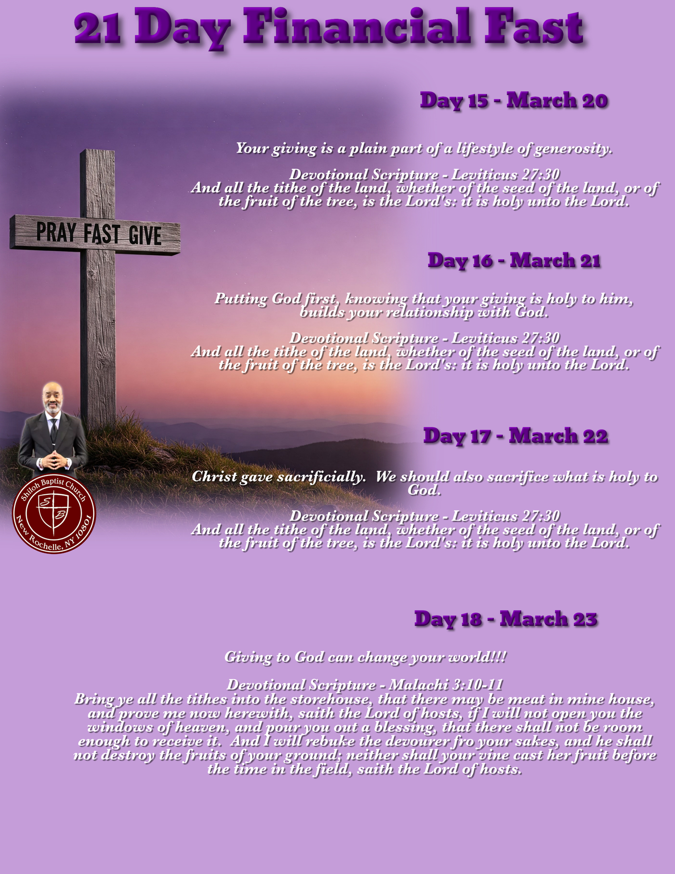 During this 21 Day Financial Fast we will be eliminating wasteful spending on things we don't need. This fast will include daily prayer & devotional scriptures to keep us focused. At the end of the fast, we are asking that you sow a seed of whatever savings or increase you see.